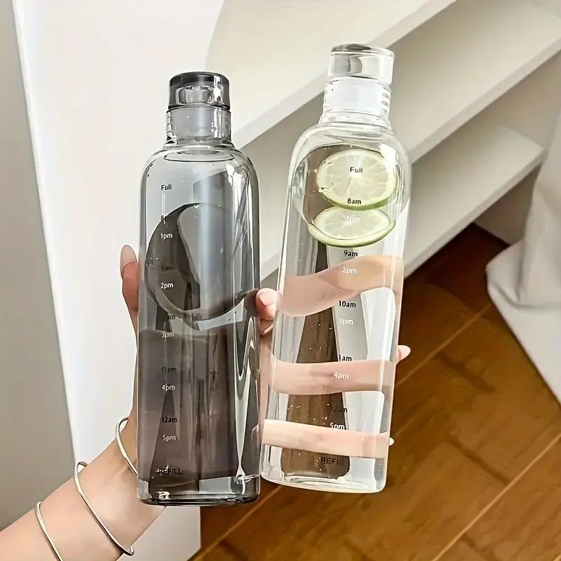 MOOZICO - زجاجة مياه زجاجية من موزيكو مزودة بعلامة زمنية - سعة 500 مل، مقاومة للتسرب وقابلة لإعادة الاستخدام - زجاجة شفافة خالية من مادة بيسفينول أ بأغطية ملونة - زجاجات مياه للثلاجة، حليب(أسود)