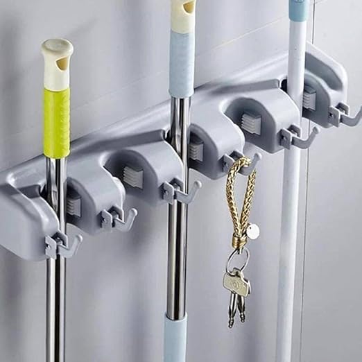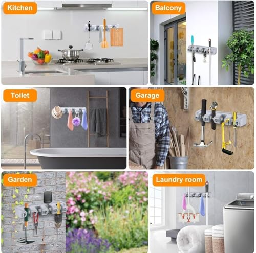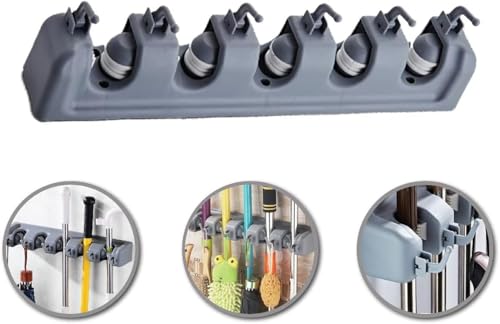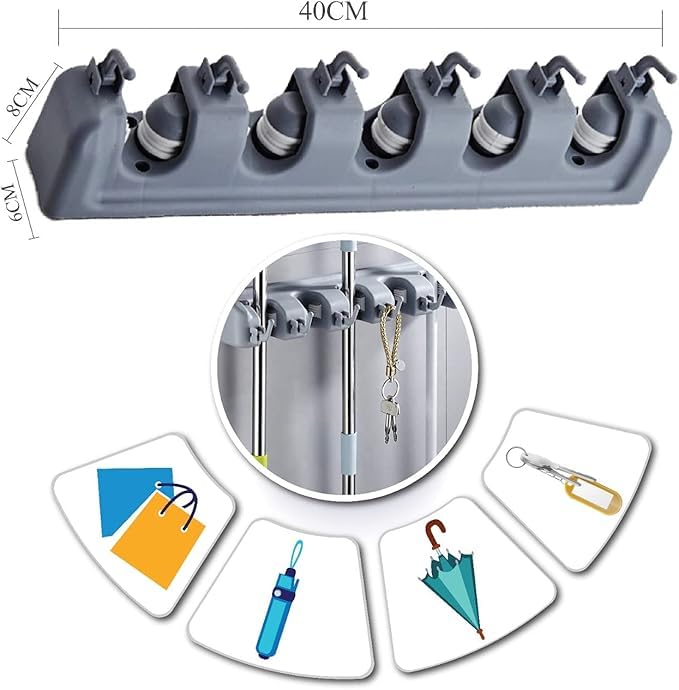 - تصميم متعدد الاستخدامات: حامل جداري بـ 5 فتحات وخطافات قوية لتنظيم المكانس والممسحات والمساحات والجاروف وأدوات التنظيف المختلفة في مكان واحد