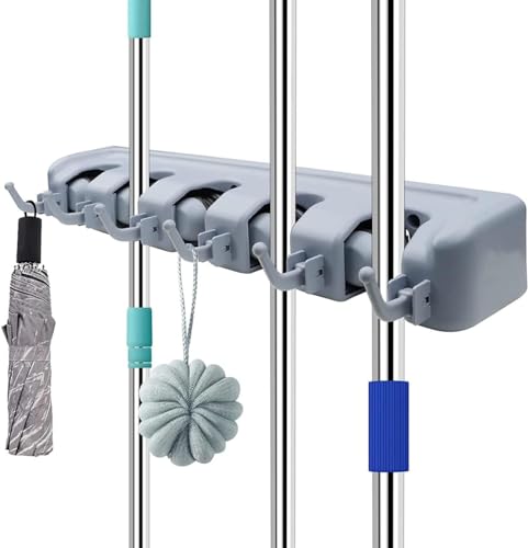 Generic - حامل مساحة موب ومقشة منظم بحامل يثبت على الحائط يوفر التخزين للمطبخ والحديقة والجراج والمكاتب مزود بخمس فتحات وستة خطافات سيليكون رمادي