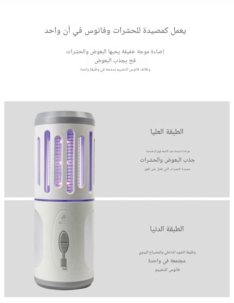 - - **فعال صامت:** - يعمل بهدوء أثناء قتل الحشرات بكفاءة، مما يضمن لك الاسترخاء أو العمل دون تشتيت الانتباه.
