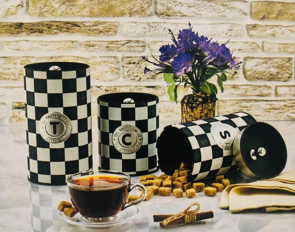 - اجمل هدايا عيد الام طقم كوفي شطرنج 3*1 طقم علب صاج صناعه تركي قطعه فنيه في مطبخك مكون من 3 علب بمقاسات مختلفة للشاي T والسكر S والقهوه C بغطاء كبس محكم الغلق