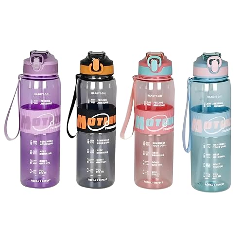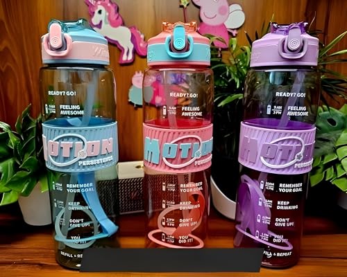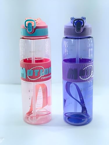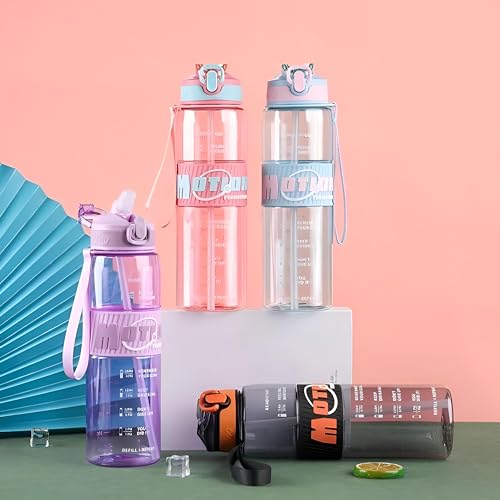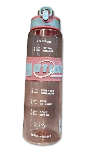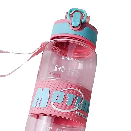 Generic - زجاجة مياه تحفيزية - سعة 1 لتر خالية من مادة بيسفينول ايه ومانعة للتسرب مع مؤشر زمني وحزام حمل، تصميم بلون وردي وأزرق للحفاظ على ترطيبك طوال اليوم