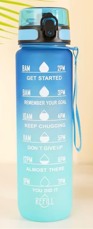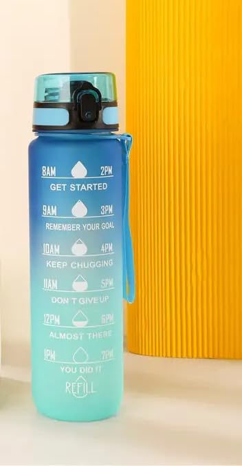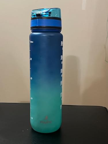 PlayPal - زجاجة مياه تحفيزية سعة 32 اونصة (1 لتر)، مصنوعة من بلاستيك التريتان الخالي من البيسفينول ايه، زجاجة لياقة بدنية رياضية مع مؤشر للوقت (ازرق متدرج)