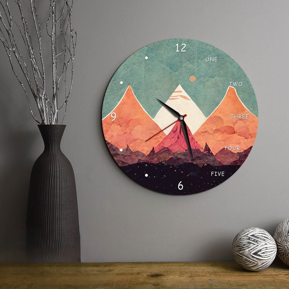 - تصميم جمالي: ساعة حائط عصرية تتميز بعمل فني مذهل للمناظر الطبيعية الجبلية بألوان برتقالية وأزرق مخضر، مثالية لديكور المنزل المعاصر