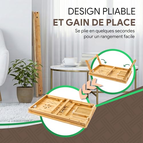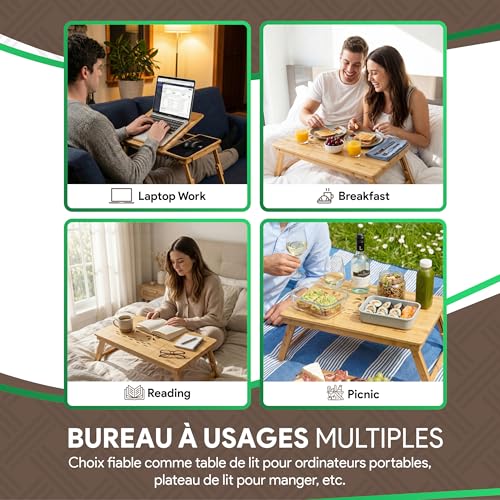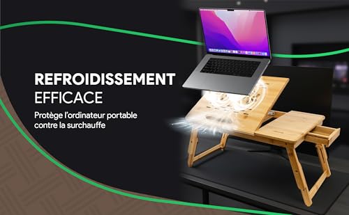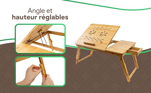 MOVADEK - Adjustable Bamboo Folding Laptop Table Bed Desk with Drawer Mouse Mat and Cable Organizer PC Holder for Bed Sofa