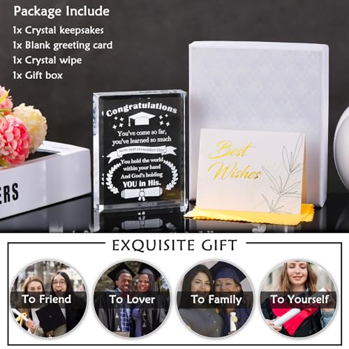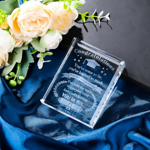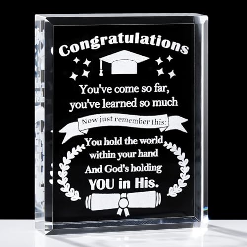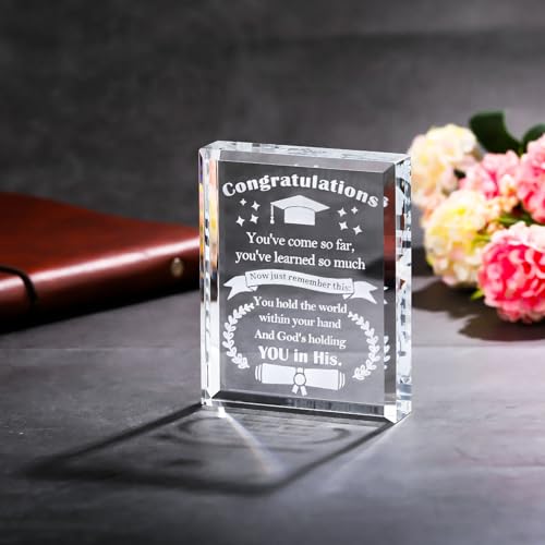 - 🎁مواد وجودة عالية - مصنوع من كريستال كيه 9 عالي الجودة مصقول يدويًا، وهو شفاف ولامع ومتين للغاية. الكلمات المحفورة بالليزر داخل الكريستال لن تتلاشى أو تختفي أبدًا. لا يمكنها فقط الاحتفال بمتعة التخرج لها أو لها بل تترك لها أو له هدية تذكارية ذات مغزى في موسم التخرج الخاص لعام 2024