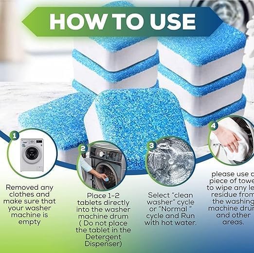 - أقراص تنظيف الغسالة من موفيل للغسالات ذات التحميل العلوي والغسالات شبه الأوتوماتيكية متوافقة مع جميع أنواع الغسالات بما في ذلك الغسالات اتش اي. يذوب قرص منظف الغسالة هذا في الماء وينظف جميع أجزاء الغسالة المرئية وغير المرئية من الغبار وجميع الجزيئات الأخرى التي تجعل الغسالة متسخة وذات رائحة كريهة. ستكون الغسالة منعشة ونظيفة وجاهزة للغسيل التالي.