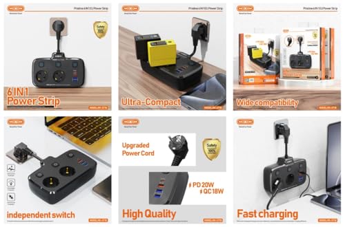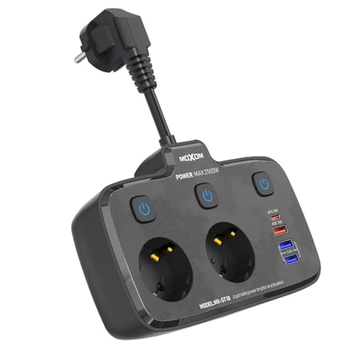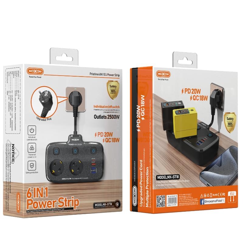 MOXOM - مشترك كهرباء أوروبي 6 في 1 من موكسوم، مصمم بمنفذين 2500 وات ومفتاح تشغيل/إيقاف فردي لأجهزة متعددة بتقنية الشحن السريع 18 وات وتقنية توصيل الطاقة 20 وات - لون أسود، موديل MX-ST18