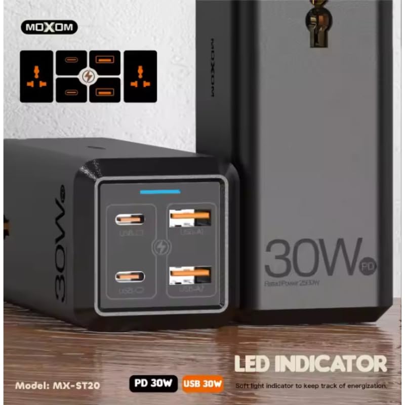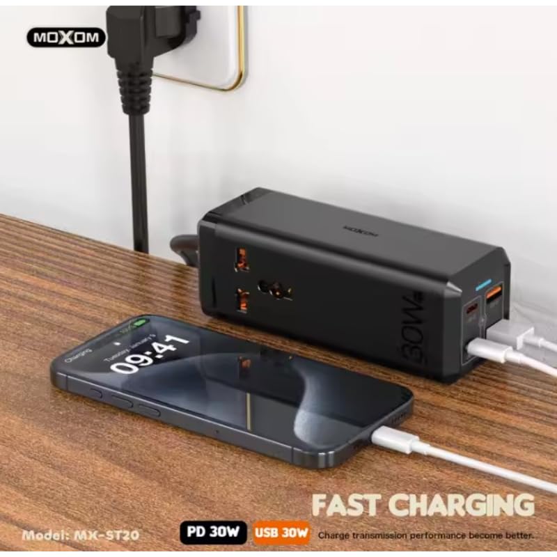 MOXOM - وصلة تمديد مشترك الطاقة الكهربائية MX-ST20 مع منفذي USB ومقبس ومفتاح و2 منفذ شحن USB-سي عملي متعدد الوظائف من موكسوم - أسود