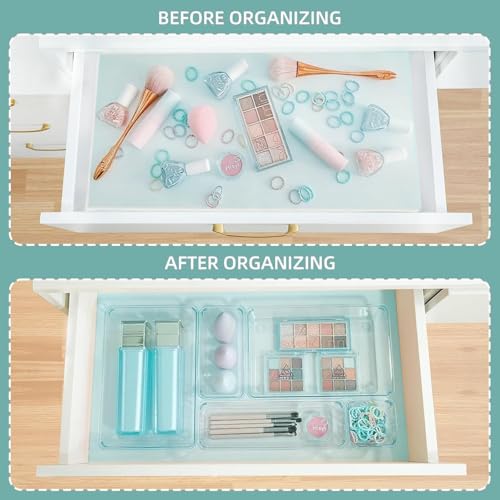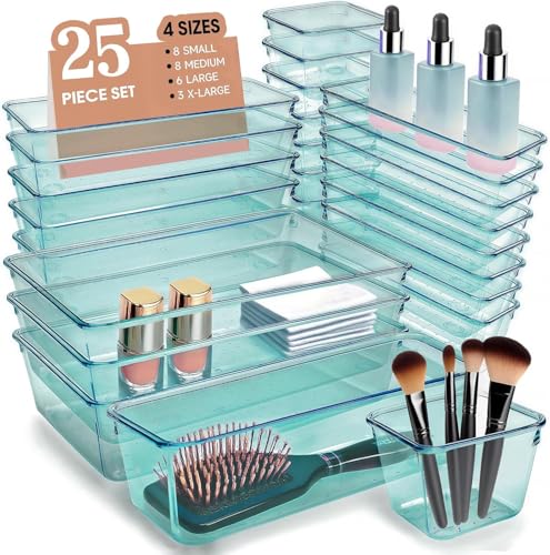 Generic - مجموعة منظم ادراج من موربورت، منظم مكياج فانيتي بـ 4 احجام، صناديق تخزين بلاستيكية شفافة للمكياج والمجوهرات وادوات متعددة للمطبخ والحمام والمكتب وغرفة النوم (25) (ازرق سماوي)