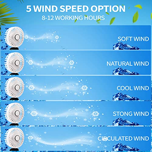 - 【5 سرعات قابلة للتعديل】تنتج ريش المروحة الحلزونية طاقة رياح قوية تحت الضغط العالي، مع أقصى وقت تبريد يصل إلى 18 ساعة. تعتمد مدة تشغيل البطارية على السرعات المختلفة: السرعة 1 (18 ساعة)؛ السرعة 2 (16 ساعة)؛ السرعة 3 (14 ساعة)؛ السرعة 4 (12 ساعة)؛ السرعة 5 (10 ساعات).