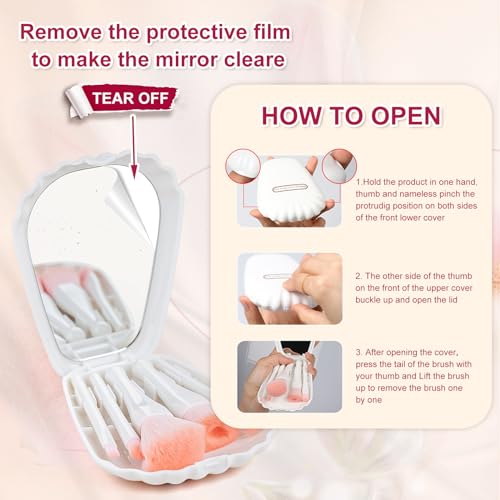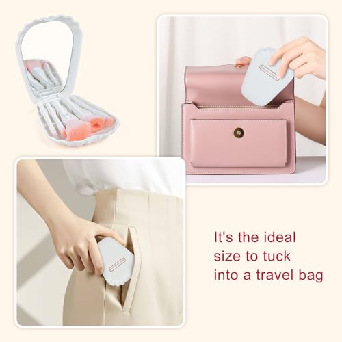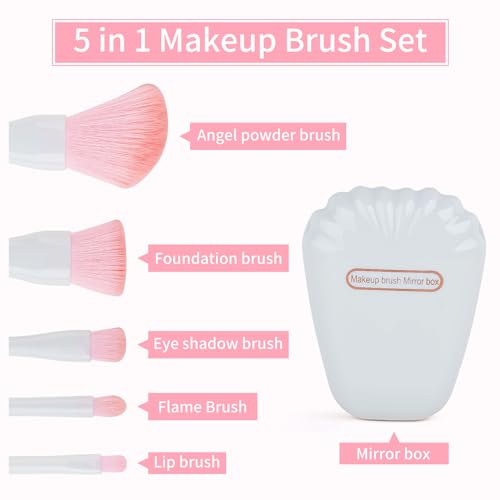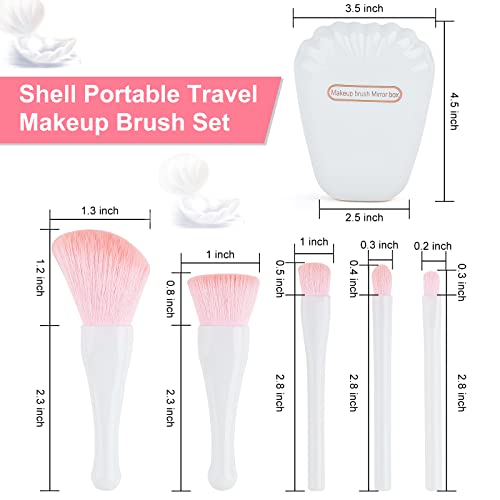 MS. WENNY - مجموعة فرش المكياج مع مراية، مجموعة مكياج صغيرة محمولة للسفر، مجموعة فرش كريم الأساس والايشادو وبودرة الخدود 5 قطع على شكل صدفة