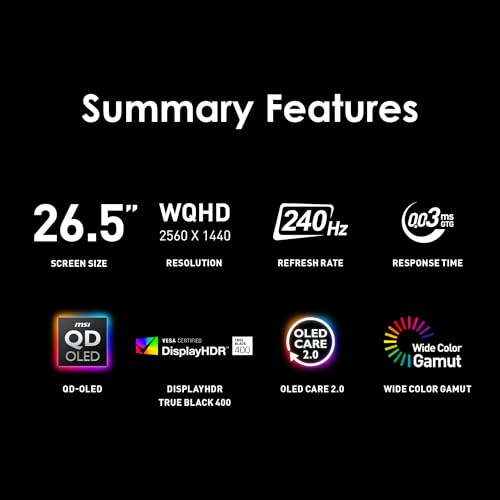 MSI - شاشة ألعاب ماج 273QP كيو دي-او ال اي دي×24، مقاس 27 بوصة، بدقة 2560 × 1440 (QHD)، معدل تحديث 240 هرتز ومنافذ HDMI وديسبلاي بورت بمكبر صوت، زمن استجابة 0.03 مللي ثانية من ام اس اي، أسود
