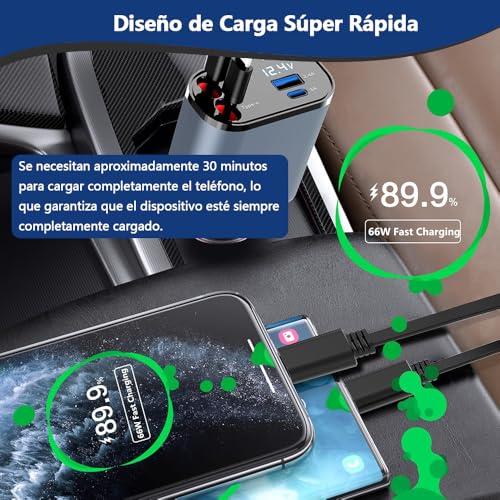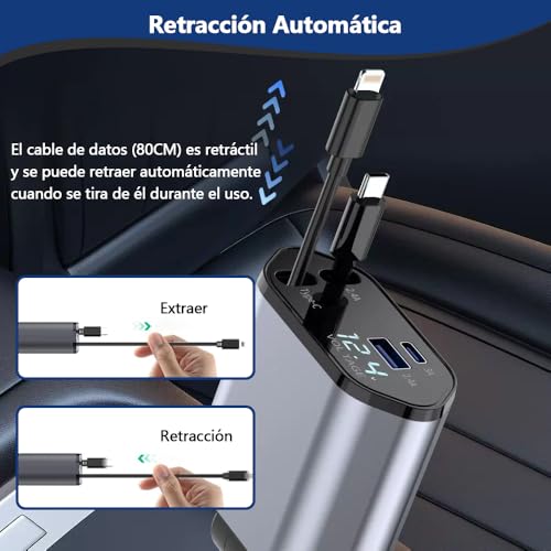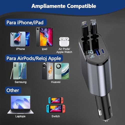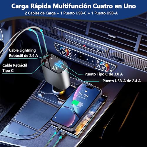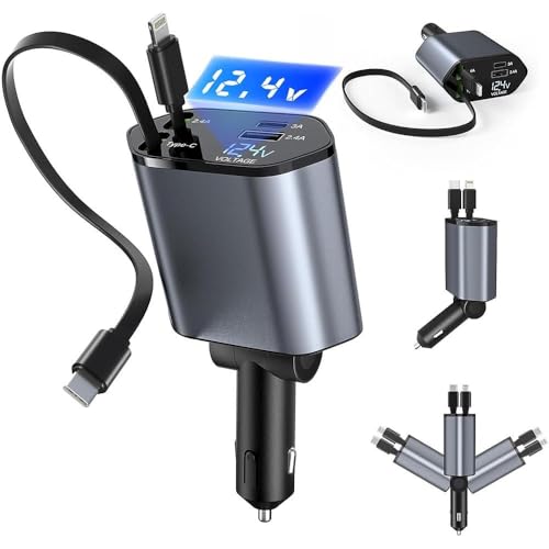 MSUNGFIVA - شاحن سيارة قابل للسحب من النوع سي بقدرة 120 واط من ام سونجفيفا، شاحن سيارة سريع الشحن 4 في 1، مع 2 كيبل قابل للسحب (80 سم) ومنفذي USB، لاجهزة اندرويد وايفون 15/14/13 وهواوي وشاومي وايباد