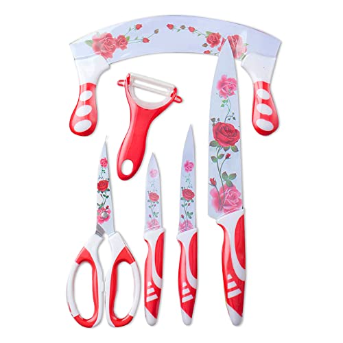 MT - طقم سكاكين وقطاعة سيراميك ومقص ومقشرة من ام تي - 6 قطع، ابيض احمر