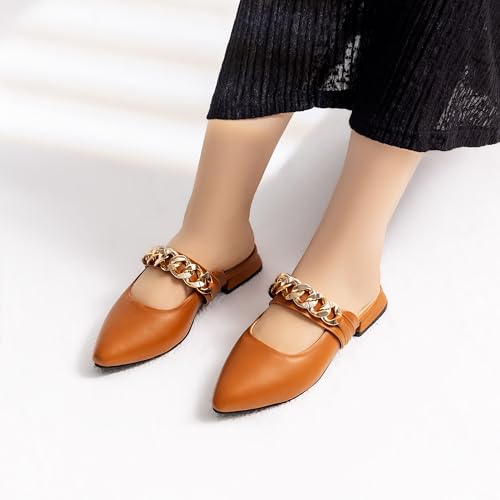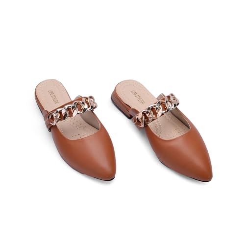 Life Stylish - حذاء SB-17 من الجلد مفتوح من الخلف ومسطح ومزين بسلسلة للنساء