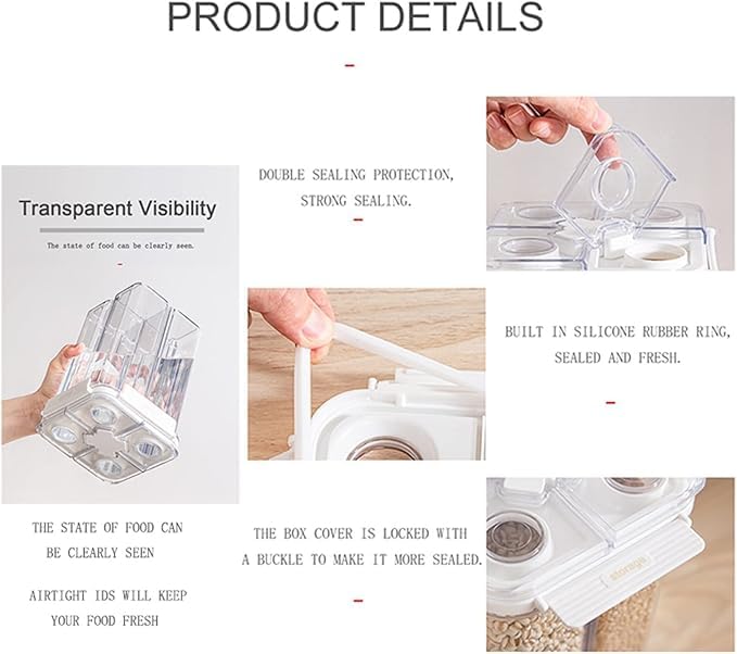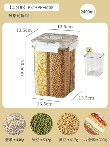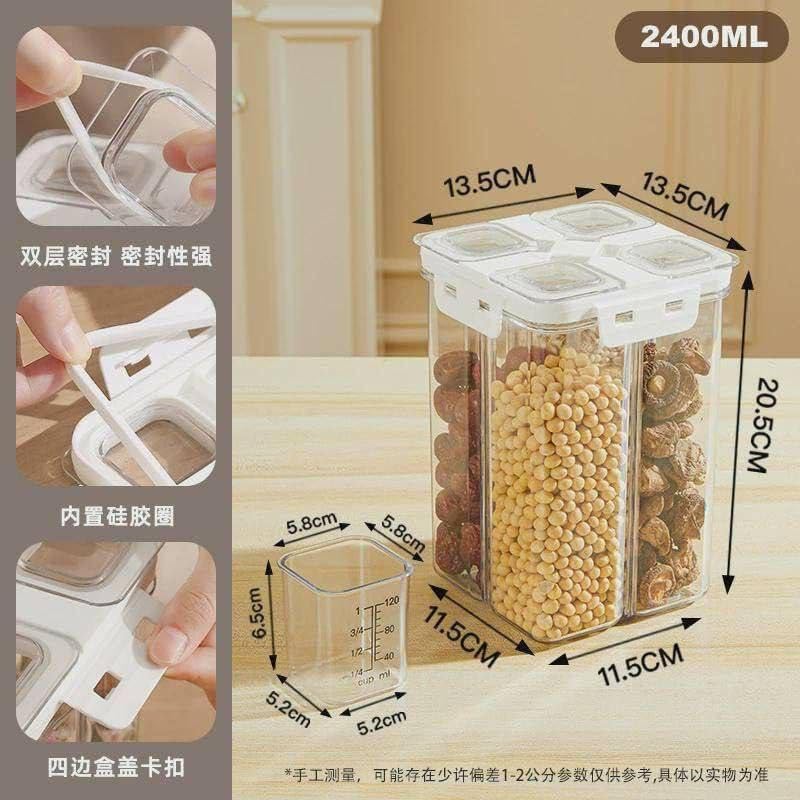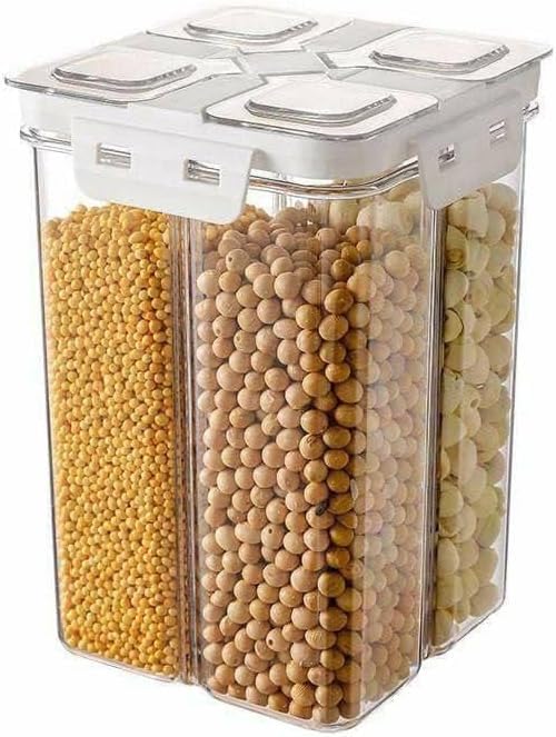 - ✅ أربعة أقسام عملية: مثالية لتخزين أنواع مختلفة من البقوليات والحبوب في وعاء واحد، مما يقلل الفوضى ويوفر المساحة في مطبخك.