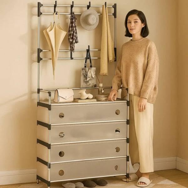 - تصميم متعدد الوظائف: يجمع بين 4 أدراج واسعة للملابس والأشياء الشخصية، ورف تعليق علوي مع خطافات للمعاطف والحقائب والأوشحة والقبعات، بالإضافة إلى رف تخزين أحذية مفتوح في القاعدة لتنظيم كامل للمدخل