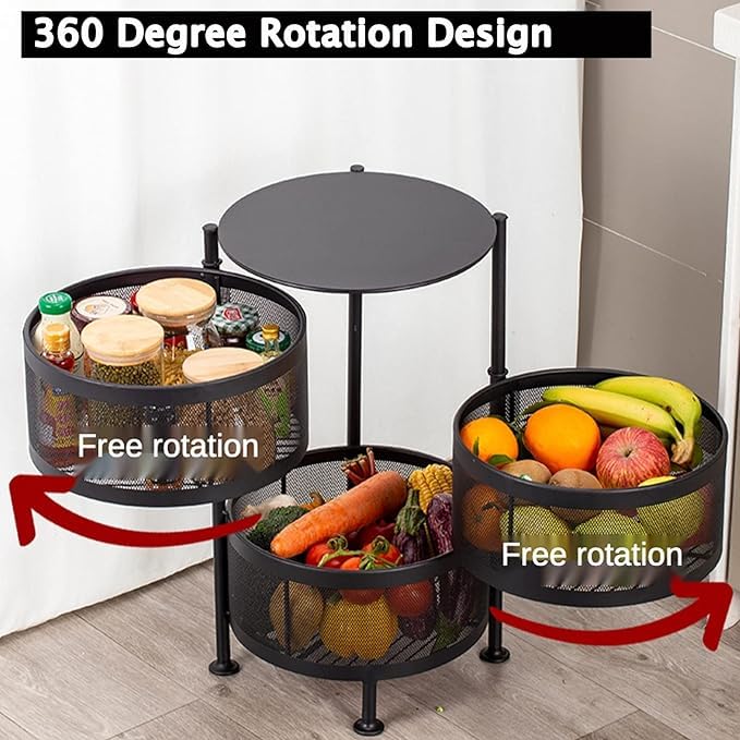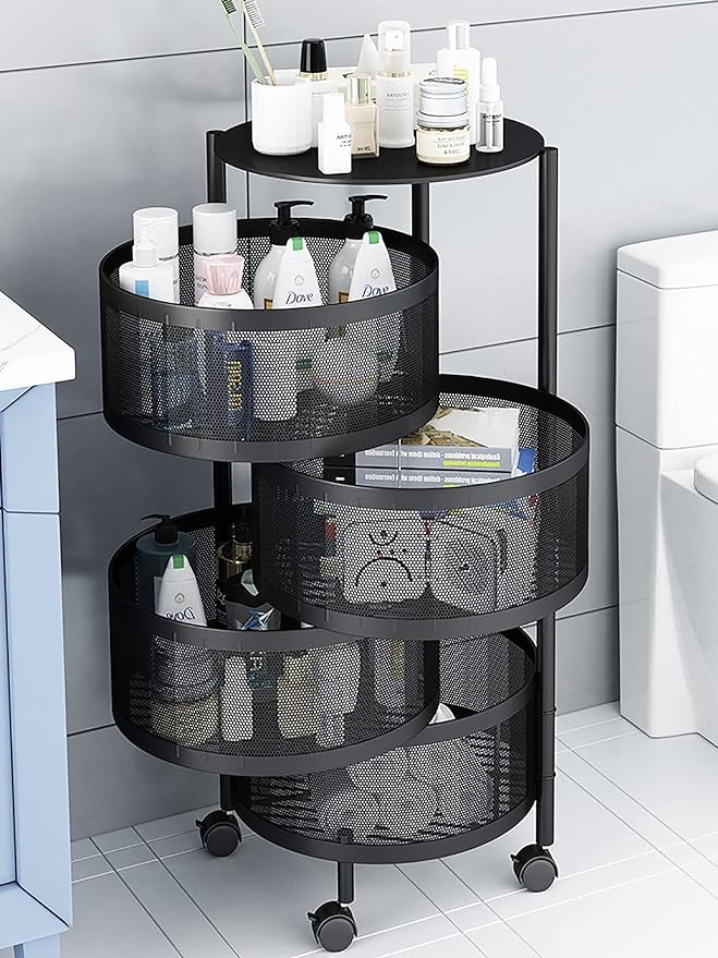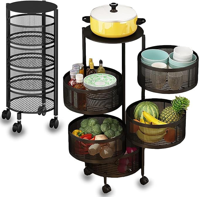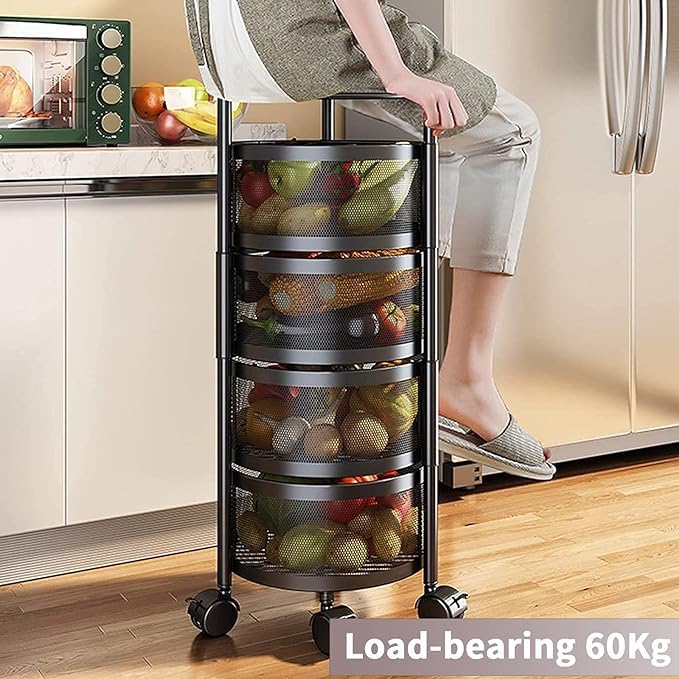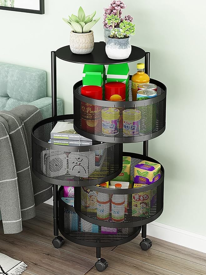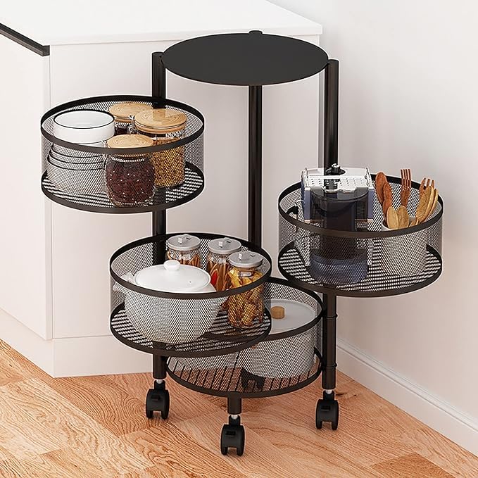 Generic - رف مطبخ دوار متعدد الطبقات بسلال تخزين للوجبات الخفيفة والفواكه والخضروات، عربة معدنية برفوف مع عجلات وصناديق تخزين دائرية للمطابخ الصغيرة، ادوات تنظيم طويلة وواسعة من 4 طبقات