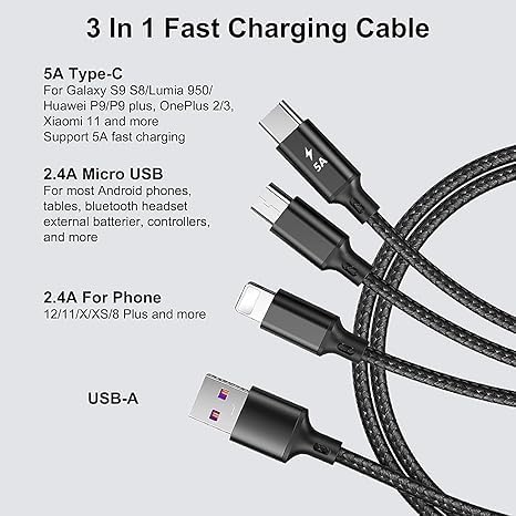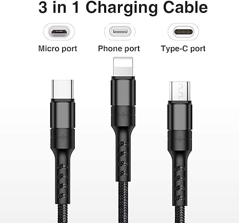 - 【كابل شحن متعدد 3 في 1】كابل شحن 3 في 1 مع منافذ موصل اي بي ومايكرو USB ونوع سي 3. عندما تكون في السيارة أو المكتب أو السفر، فأنت تحتاج فقط إلى كابل واحد لشحن جميع الهواتف الذكية. (ملاحظة: تم تصميم كابل الشحن المتعدد هذا للشحن فقط، ولا يدعم نقل البيانات.)