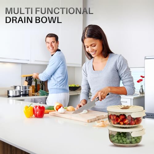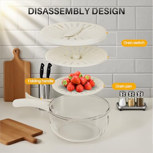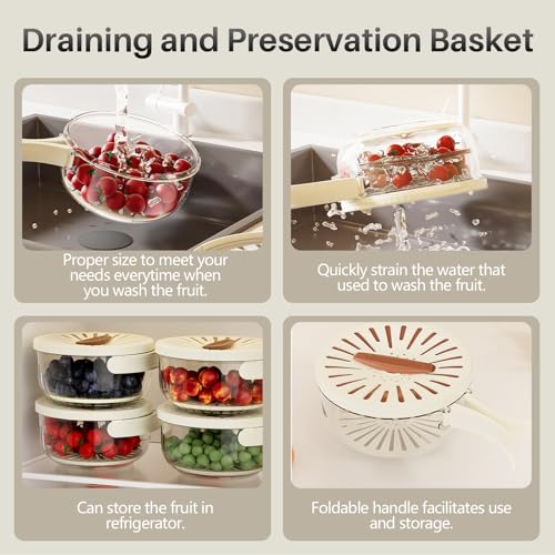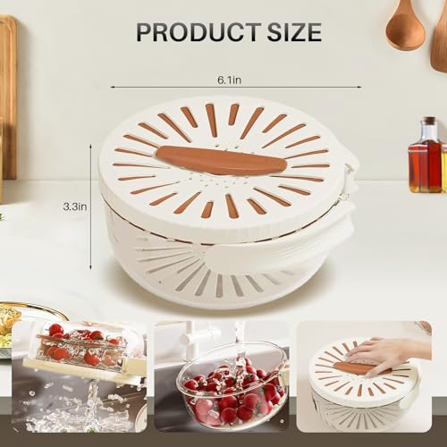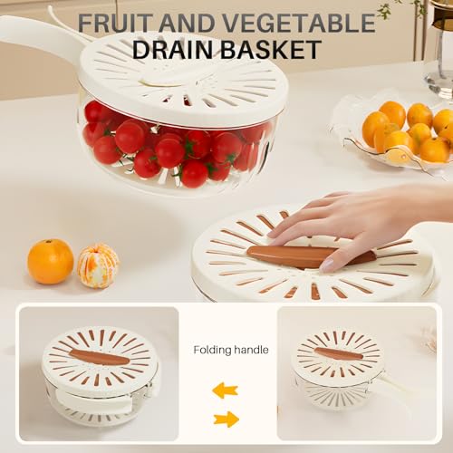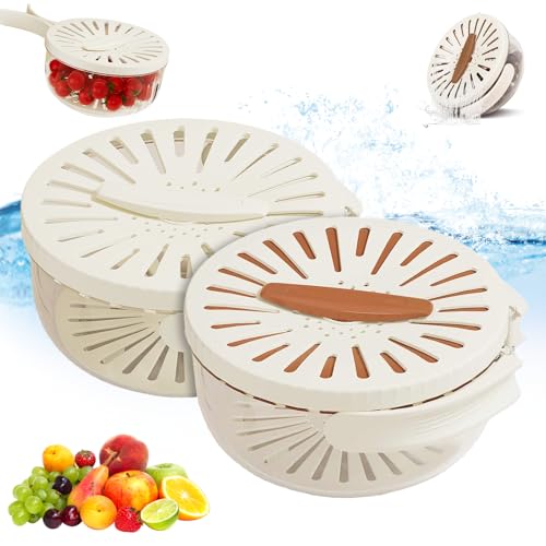 Mzario - وعاء غسيل فواكه متعدد الوظائف مع مصفاة مع غطاء، قطعتان من حاويات تخزين الفاكهة للثلاجة، سلة تصريف 2 في 1 بمقبض قابل للطي للمطبخ والثلاجة والنزهات والتخييم (ابيض، بني)