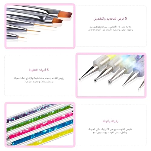 - تشتمل المجموعة على فرش وأدوات تنقيط بأحجام مختلفة، مما يجعلها مثالية للأظافر الطبيعية والجل والأكريليك سواء في المنزل أو في صالونات التجميل الاحترافية.