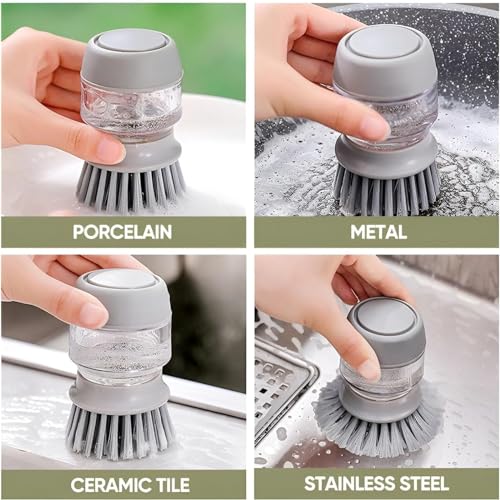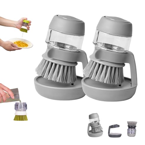 RUDELL - أداة غسيل الأطباق بضغطة واحدة، فرشاة يد مزدوجة الاستخدام تضخ الصابون، منظف أواني مع خزان سائل غسيل، ليفة مطبخ بقاعدة لتنظيف الأواني، رمادي، 2 قطعة