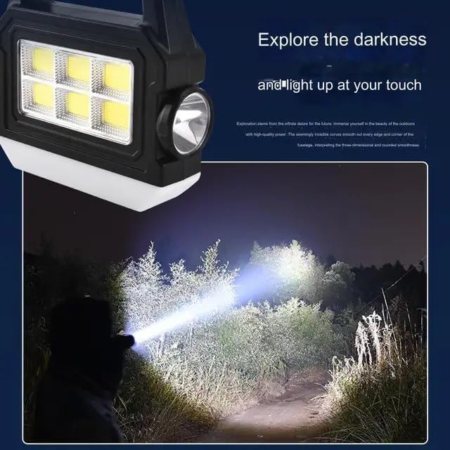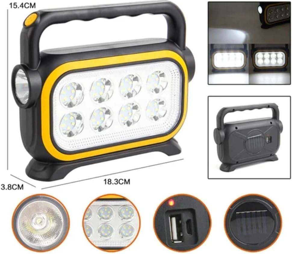 - مصباح يدوي يعمل بالطاقة الشمسية متعدد الوظائف خفيف الوزن ومقاوم للماء. يحتوي الكشاف على لونين من الضوء الأبيض (ليد). يمكن شحن هذا الكشاف بألواح الطاقة الشمسية وكذلك بالكهرباء. يحتوي على مرفق شحن USB، لذلك يمكنك شحن هاتفك المحمول أيضًا.في حالات الطوارئ. هذا الكشاف مصنوع من بلاستيك ايه بي اس القوي للغاية، لا تقلق في حالة الانزلاق من اليد أو السقوط من ارتفاع، فالكشاف لديه القدرة على امتصاص الصدمات بارتفاع 1 متر. يستغرق الشحن الكامل للبطارية من 2 إلى 3 ساعات فقط.