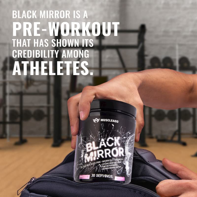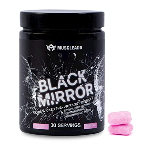 Muscle Add - مسحوق مكمل غذائي قبل التمرين بلاك ميرور من ماسل اد بالارجينين والكافيين وبيتا الالانين والكرياتين لتضخيم العضلات - عالي الجودة - 30 حصة - 253.8جم - نكهة العلكة، كارنيتين-إل