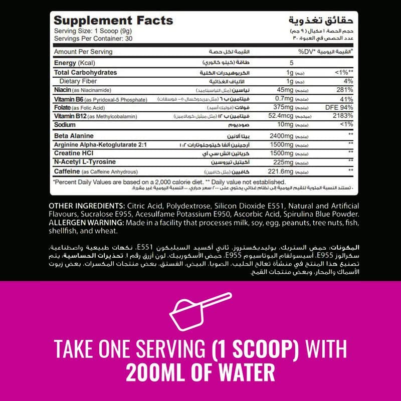 - طاقة أكثر: 221.6 ملجم من الكافيين لكل حصة تعزز التركيز العقلي وشدة التمارين.
