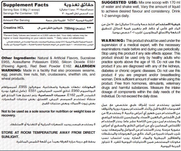 - الجرعة اليومية من ملعقة واحدة من هذا المنتج تحتوي على 750 جرام من الكرياتين HCL.