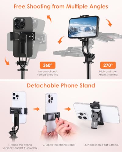 - 📌 زاوية قابلة للتعديل من 270° إلى 360°: يدعم حامل الهاتف تعديل الإمالة العمودي بزاوية 270° والدوران الأفقي الكامل 360°، مما يضمن زوايا تصوير مرنة ويسمح لك بالتقاط اللقطات مرتفع ومنخفضة بكل سهولة. مثالي لتصوير مقاطع الفيديو التدوينية، أو الصور الجماعية أو اللقطات الفردية.