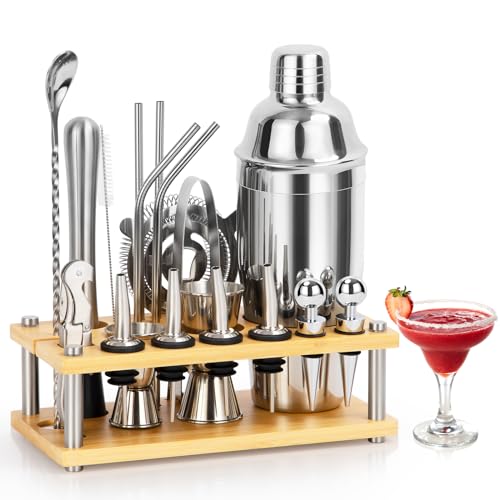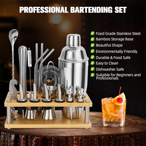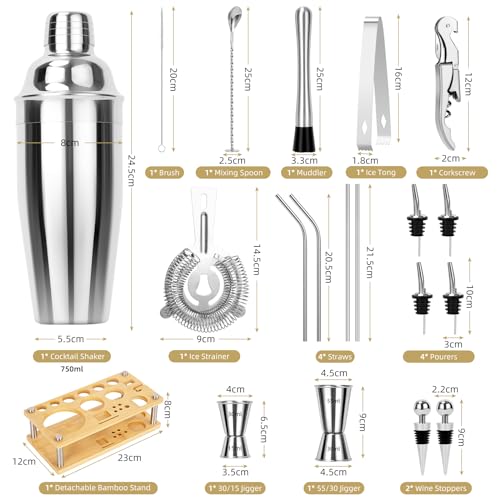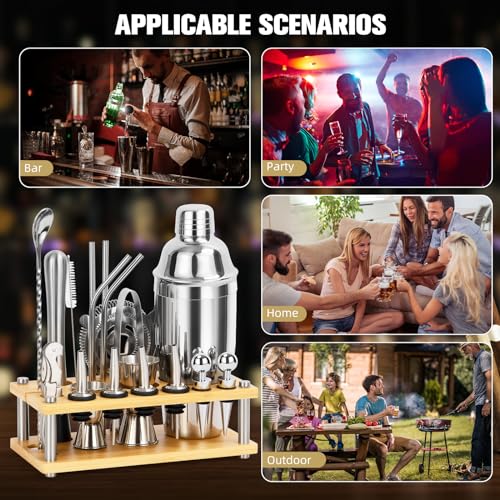 MUUKAIII - مجموعة شيكر كوكتيل مع حامل، 750 مل، 20 قطعة من اكسسوارات الكوكتيل من الستانلس ستيل، مجموعة نادل احترافية مع 4 لاصقات سيليكون غير قابلة للانزلاق، هدية للرجال والنساء والاصدقاء من موكاي
