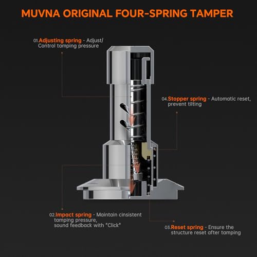MUVNA - مكبس قهوة إسبريسو مقاس 58.35 ملم من الفولاذ المقاوم للصدأ ومطور حديثًا مع ميزة رد الفعل الصوتي، مكبس قهوة مُعاير للصدمات مع هيكل محمل بأربعة زنبركات ويناسب جميع سلال فلتر القهوة مقاس 58 ملم من موفنا