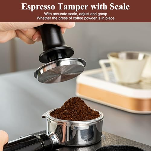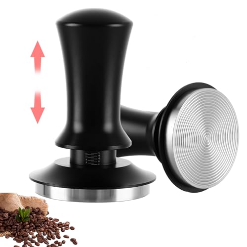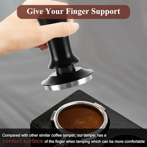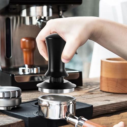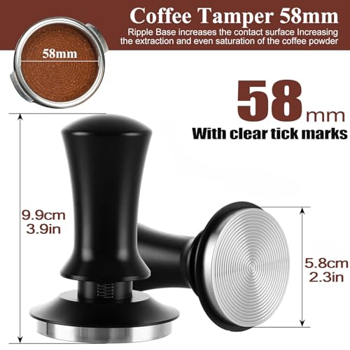 MUXHEL - مكبس قهوة اسبريسو 58 ملم مع مقياس وقاعدة من الستانلس ستيل من موكسيل، مكبس قهوة قابل للتعديل مزود بنابض ومقبض من الالومنيوم، اسود