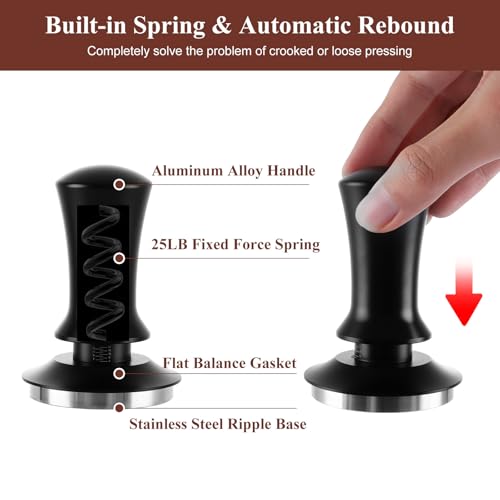 - 【قابل للإزالة】- مقبض وقاعدة مكبس القهوة المحمّل بنابض قابل للإزالة وسهل التنظيف. مناسبة لضغط الاسبريسو المطحون الطازج قبل التخمير. سهل التحميل والتفريغ، وكل جزء تمت معالجته وتصنيعه بعناية