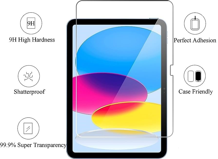 - شاشة حماية شفافة من الزجاج المقوى لجهاز ايباد 10.9 بوصة 2022 الجيل العاشر، توفر تغطية كاملة للشاشة ومقاومة للخدش.