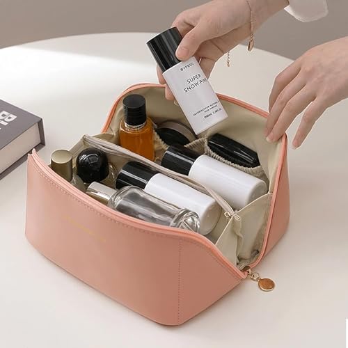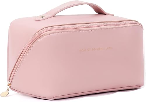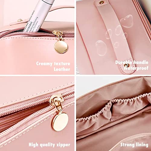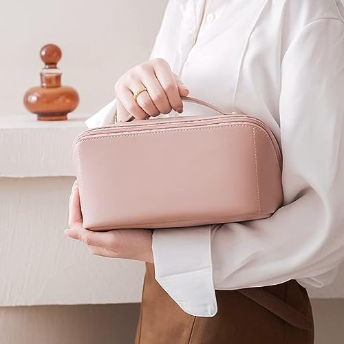 MWSLY - شنطة مكياج للسفر شنط مستحضرات تجميل بسعة كبيرة للنساء محمولة مقاومة للماء ومفتوحة ومسطحة لتنظيم ادوات الزينة مع مقسم ومقبض بينك جلد زهري
