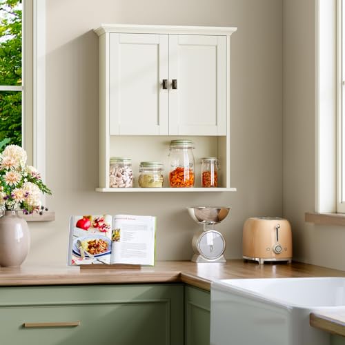 MXARLTR - دولاب جدار الحمام من مكسارلتر للتثبيت فوق المرحاض والتخزين - يأتي مزودا بأبواب ورف قابل للتعديل - خزانة أدوية خشب - أبيض كريمي