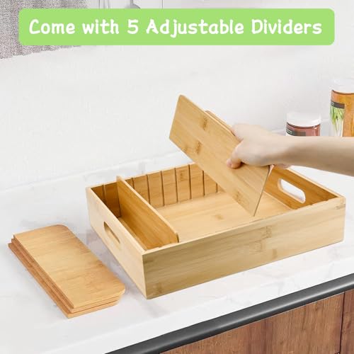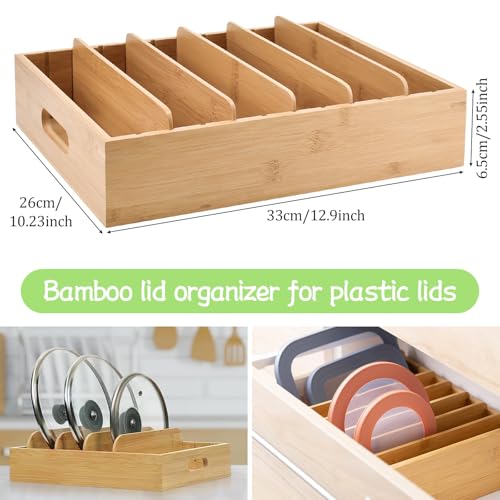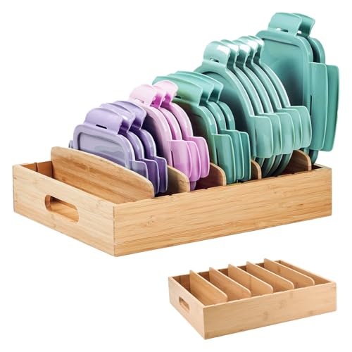 MXLMKT - منظم اغطية من الخيزران من ام اكس ال ام كيه تي للاغطية البلاستيكية، منظم مطبخ من الخيزران قابل لاعادة الاستخدام مع 5 فواصل قابلة للتعديل، منظمات ادراج المطبخ وتخزين اغطية الاواني والمقالي وحاويات، شفاف