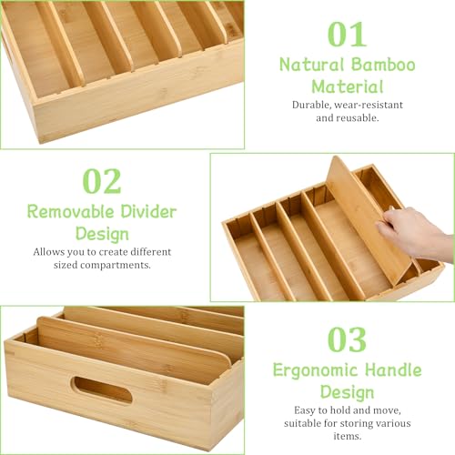 - 【تصميم فواصل قابلة للفصل】: تم تصميم منظم غطاء الخيزران مع 5 فواصل قابلة للفصل، مما يسمح لك بإنشاء مساحات تخزين بأحجام مختلفة لتلبية احتياجات التخزين للأشياء المختلفة. المقبض المحمول سهل الحمل والتحرك.