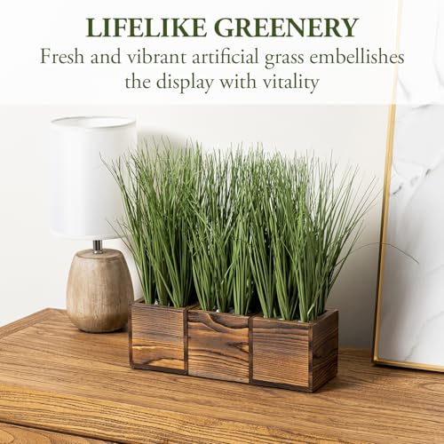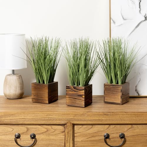 MyGift - نباتات عشب أخضر صناعي ثلاثي في صناديق زراعة خشبية صلبة محروقة بنمط ريفي من ماي جيفت خضرة صناعية حاويات مربعة مزخرفة مقاس 4 انش مجموعة 3 قطع