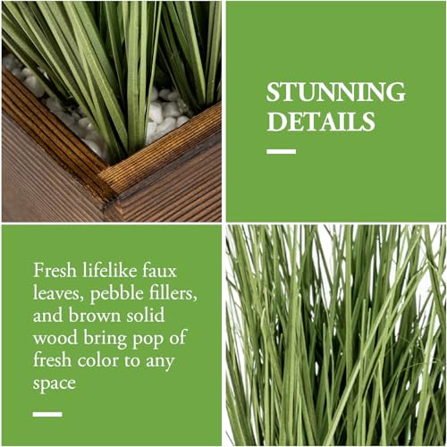 - تتميز النباتات التي يبلغ طولها 14 انش بعدة براعم من شفرات العشب الأخضر الصناعي المزروعة بوعاء مع حصى بيضاء مزخرفة صغيرة في أوعية خشبية مكعبة .