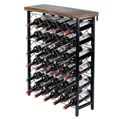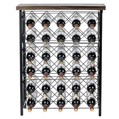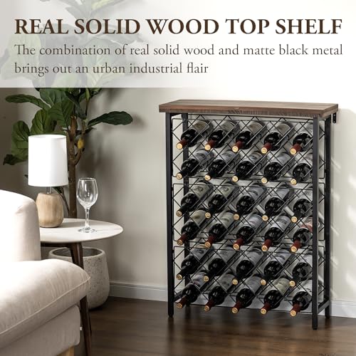 - رف تخزين زجاجات النبيذ قائم بذاته مع جزء علوي من الخشب الصلب الريفي وقاعدة معدنية سوداء مطفية لإضفاء لمسة صناعية عصرية.