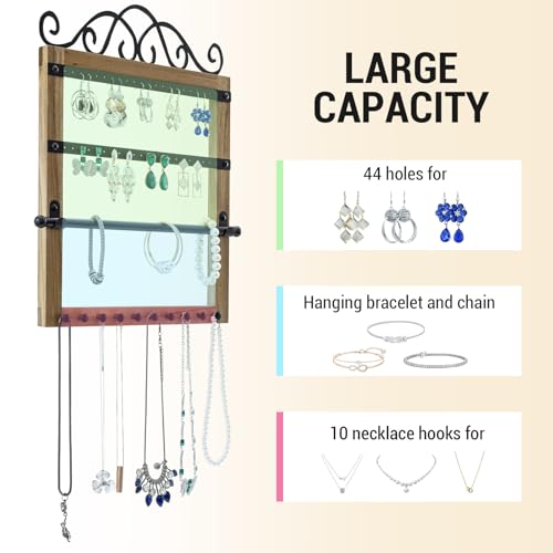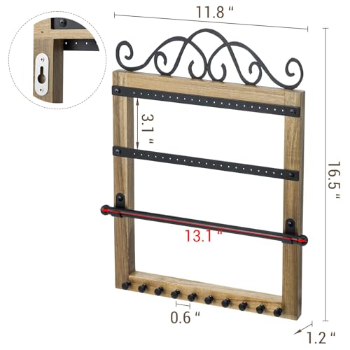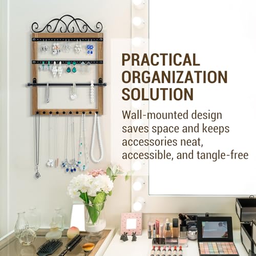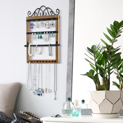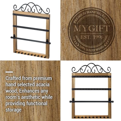 MyGift - ماي جيفت منظم مجوهرات فاخر من خشب اكاسيا والمعدن الاسود يثبت على الحائط - حامل بتصميم حلزوني للقلائد والاقراط والاساور والاكسسوارات