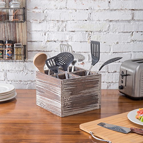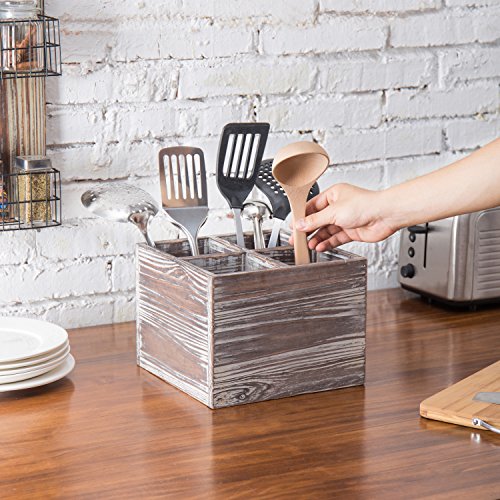 MyGift - حامل أدوات مطبخ خشبي بتصميم ريفي، حامل أدوات مائدة بأربع أقسام من ماي جيفت