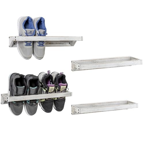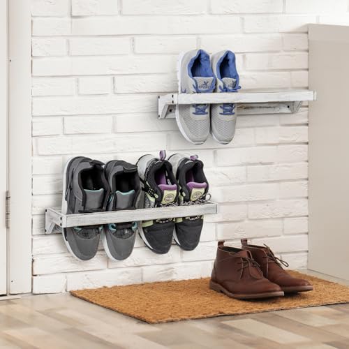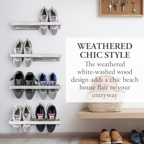 MyGift - رفوف لتنظيم وتخزين الأحذية من الخشب الصلب بطلاء أبيض عتيق، حامل أحذية موفرة للمساحة مثبت على الحائط للدولاب والمدخل وتحمل 8 أزواج من ماي جيفت، 4 قطع