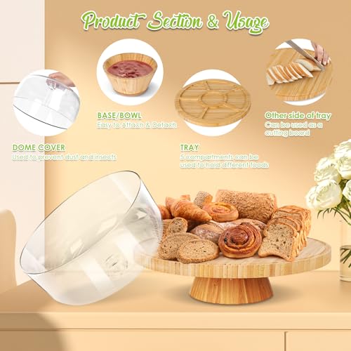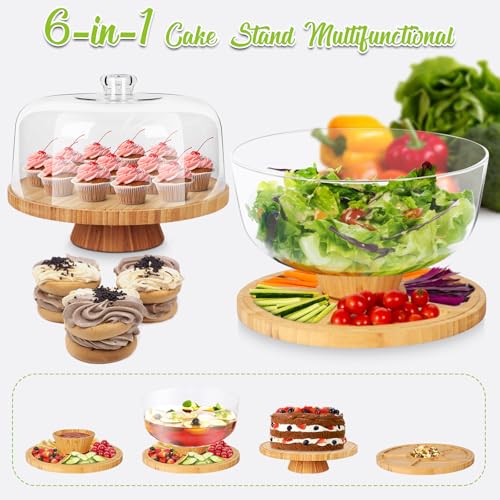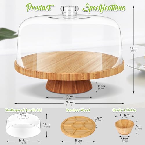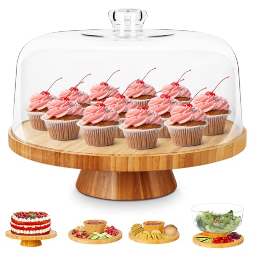 Myiosus - حامل كيك مع غطاء على شكل قبة، طبق كيك خشبي 28 سم مع غطاء، حامل عرض الكيك متعدد الوظائف 6 في 1، طبق تقديم لحفلات أعياد الميلاد وحفلات الزفاف والمطبخ من مييوسس، شفاف