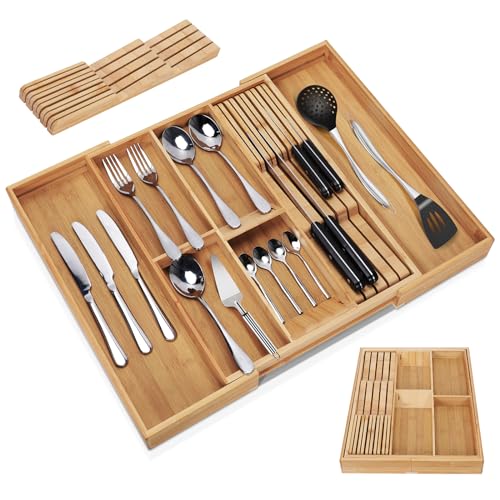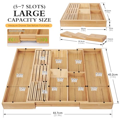 Myiosus - منظم أدراج أدوات المائدة من مييوسوس صينية مائدة الخيزران قابلة للتوسيع لحمل الأواني 5-7 مساحات تخزين حامل قابل للتعديل للسكاكين والشوك والملاعق 33-55.7 × 43.2 5 سم