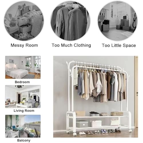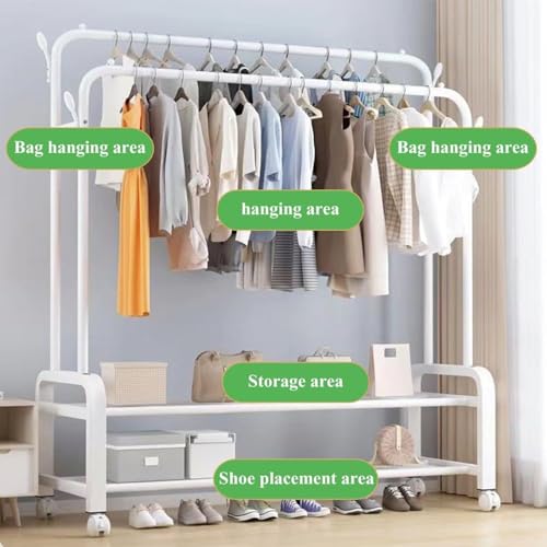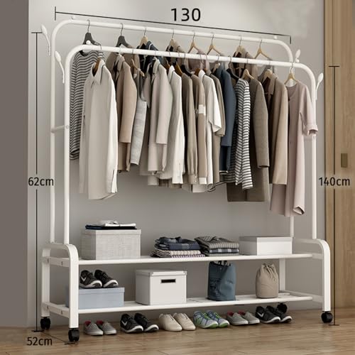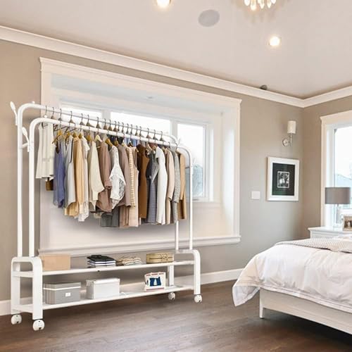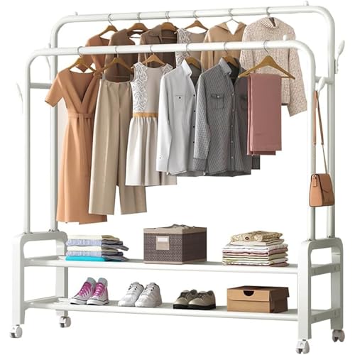 Mylindde - رف ملابس مزدوج متين من المعدن مع قضبان وعجلات، رف ملابس محمول مع رفوف وخطافات، رفوف ملابس قوية لتحميل الملابس، قضبان ملابس صناعية لغرفة النوم من ماي ليندي (أبيض)